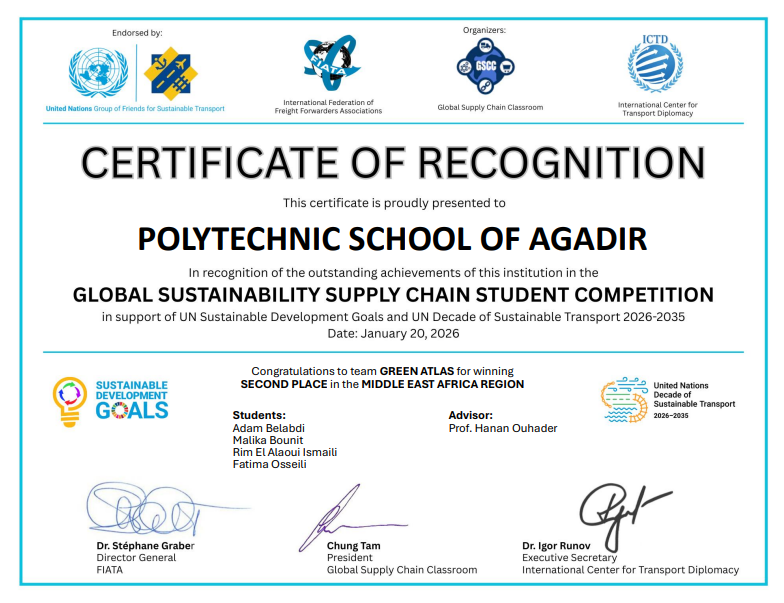 Nous sommes fiers d’annoncer la performance remarquable de nos étudiants de l’École Polytechnique d’Agadir lors du Global Sustainability Supply Chain Student Competition, une compétition internationale de prestige qui a rassemblé cette année 113 équipes de 24 pays.
